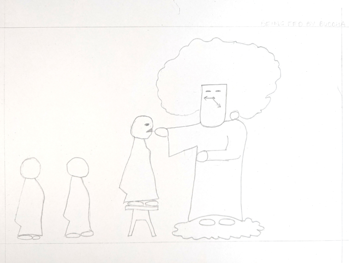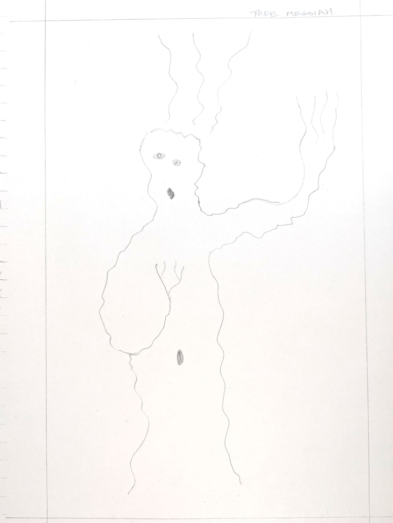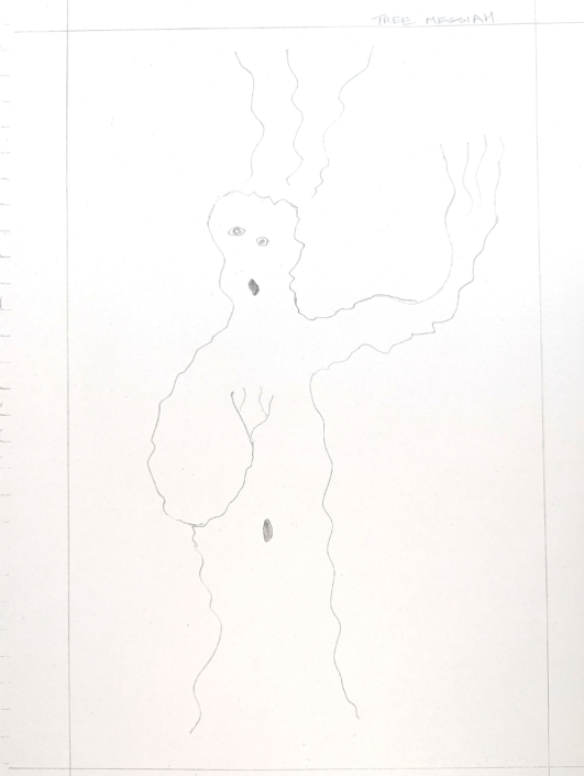 In works such as Bude the Obscure, Tree Messiah, and Focus, James embraces spontaneity and play. His practice recalls both surrealist automatism and the joyful openness of doodling, where the hand wanders freely and discovery comes through suggestion.